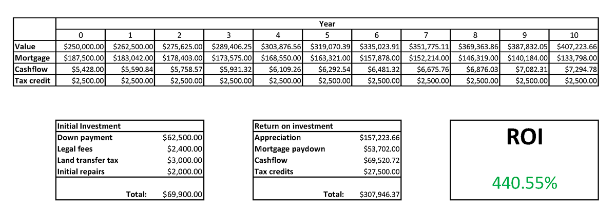 Currently I am in the 5th year of owning this property. My predictions were conservative so I’m happy to report that I’m ahead of schedule on this return on investment (ROI) plan. I paid $69,900 down to acquire this investment property and to date my property has increased in value by $81,200, the mortgage has been paid down by $23,950, I’ve enjoyed $23,329 of positive cashflow and I’ve received $12,500 in tax credits resulting in $140,979 in increased net worth as a result of my initial $69,900 of investment! To top this off the original down payment of $62,500 is still equity within the home since the mortgage started off less than the value of the real estate!