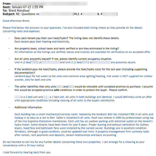The following email with attached cashflow analysis asks the questions required to ensure that I can make an informed decision without assumption. It also shows the realtor that I am serious, experienced and respectful of his time.