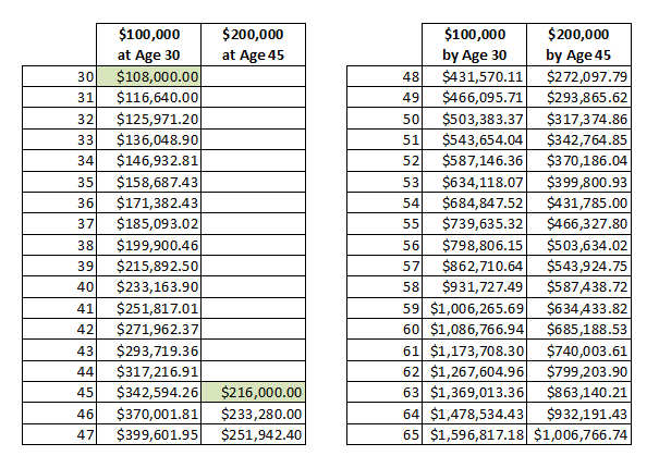 Let’s take look at a chart that shows the impact of investing $100,000 by age 30 vs. investing $200,000 by age 45 (assuming 8% average return each year). As you can see, even though the second individual invested an additional $100,000, they will have nearly $600,000 less at the age of 65… that’s a breathtaking difference!